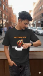 Superheroes have other work, too! This product features Ironman taking a break from saving the world while doing some ironing. Fun and quirky, right? Get this in your wardrobe to get a fun and light touch added!.