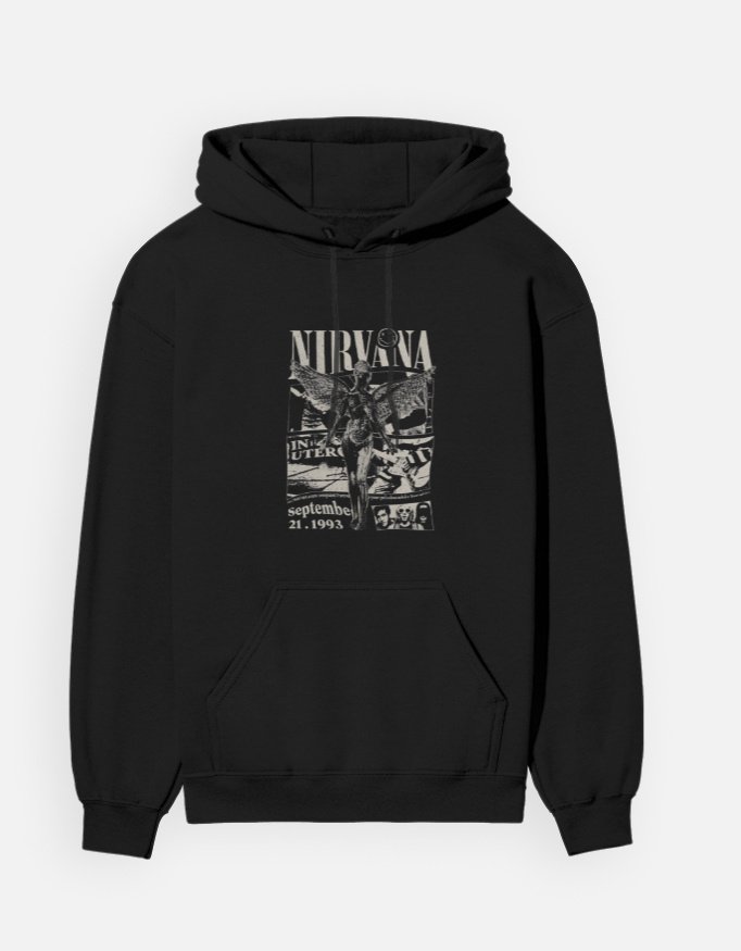 This tee in black features Nirvana’s iconic winged angel of In Utero. The timeless black with the white graphic gives a true pop to the tee, with the name of the band at the top. Below the angel is the album title and the release date, “September 21. 1993.”